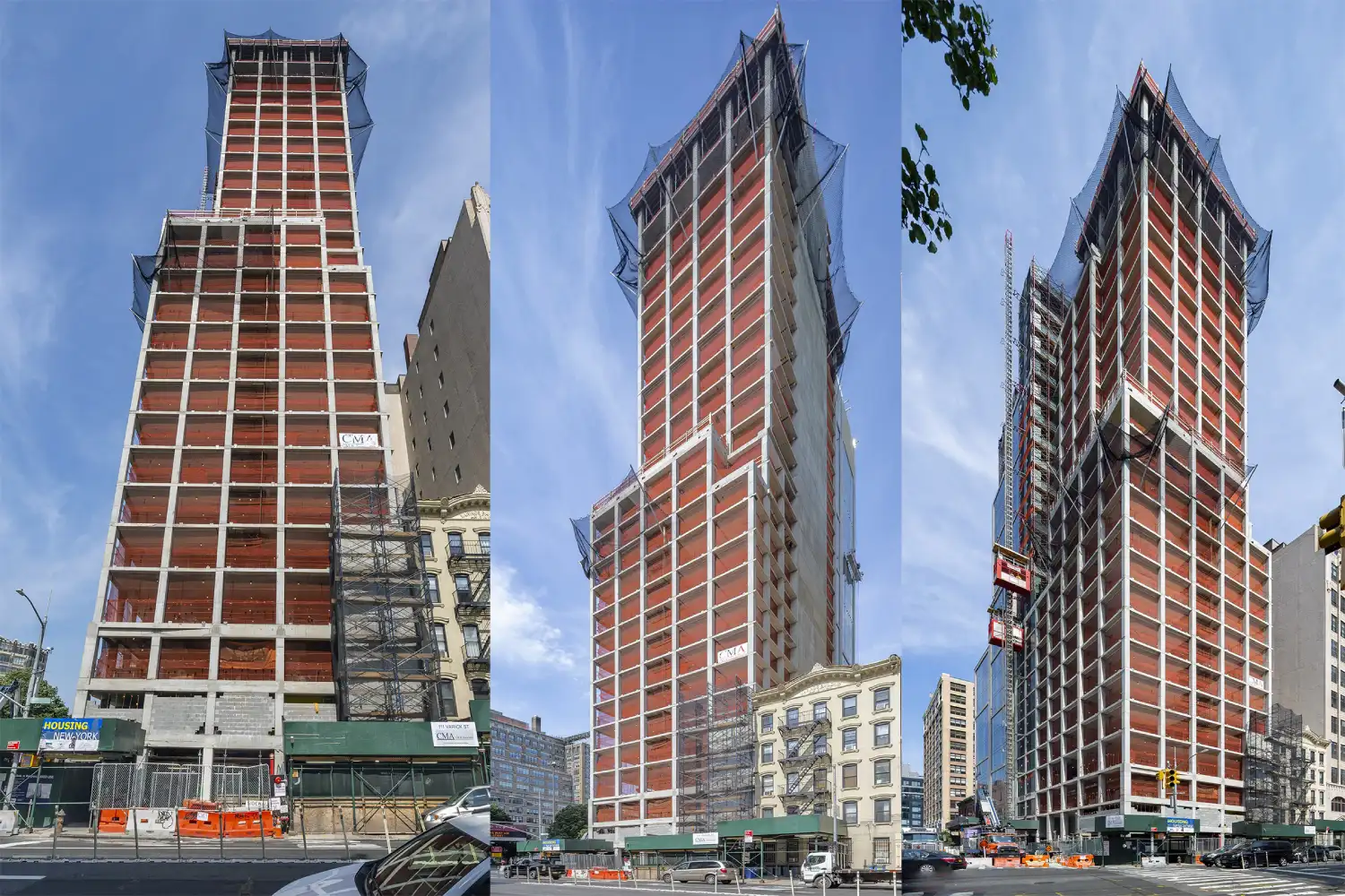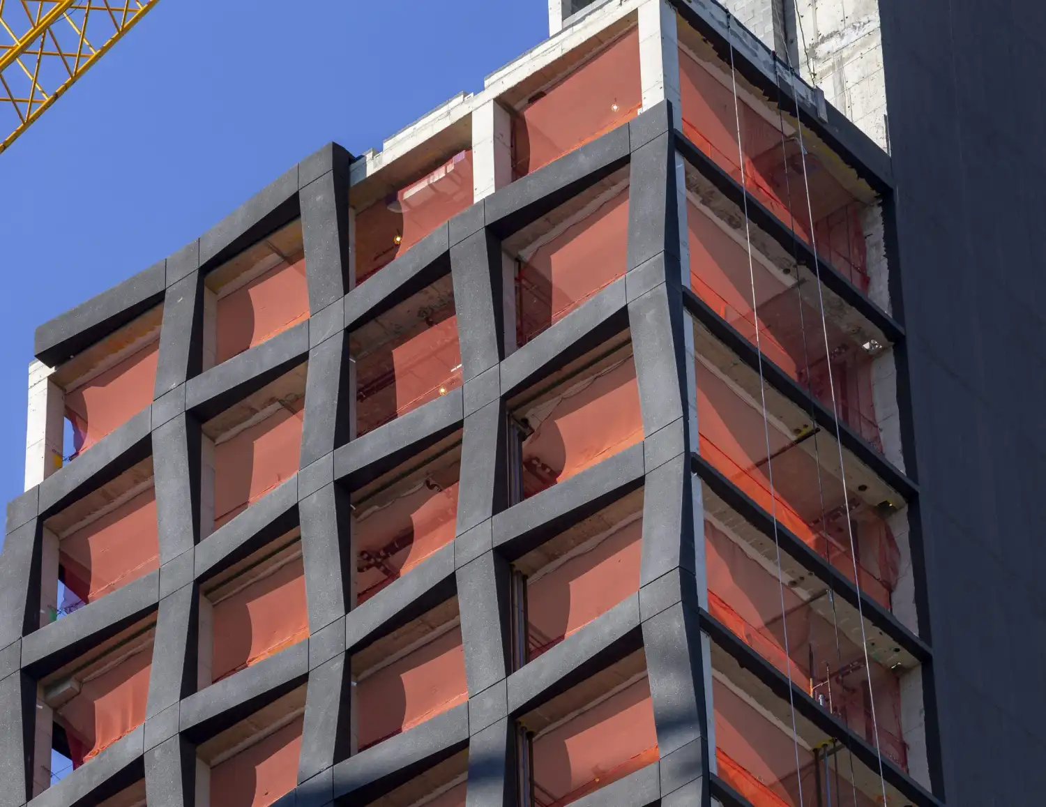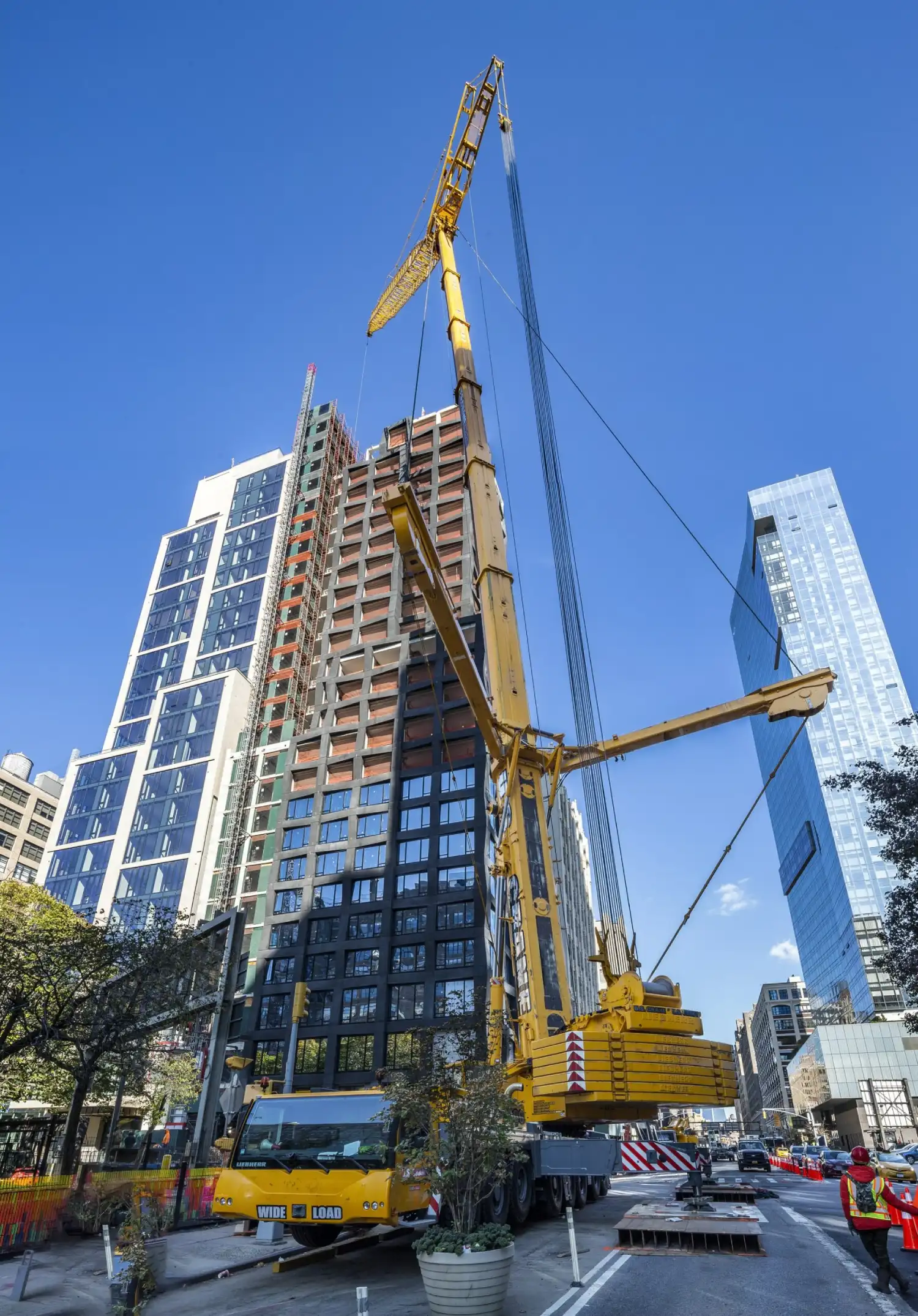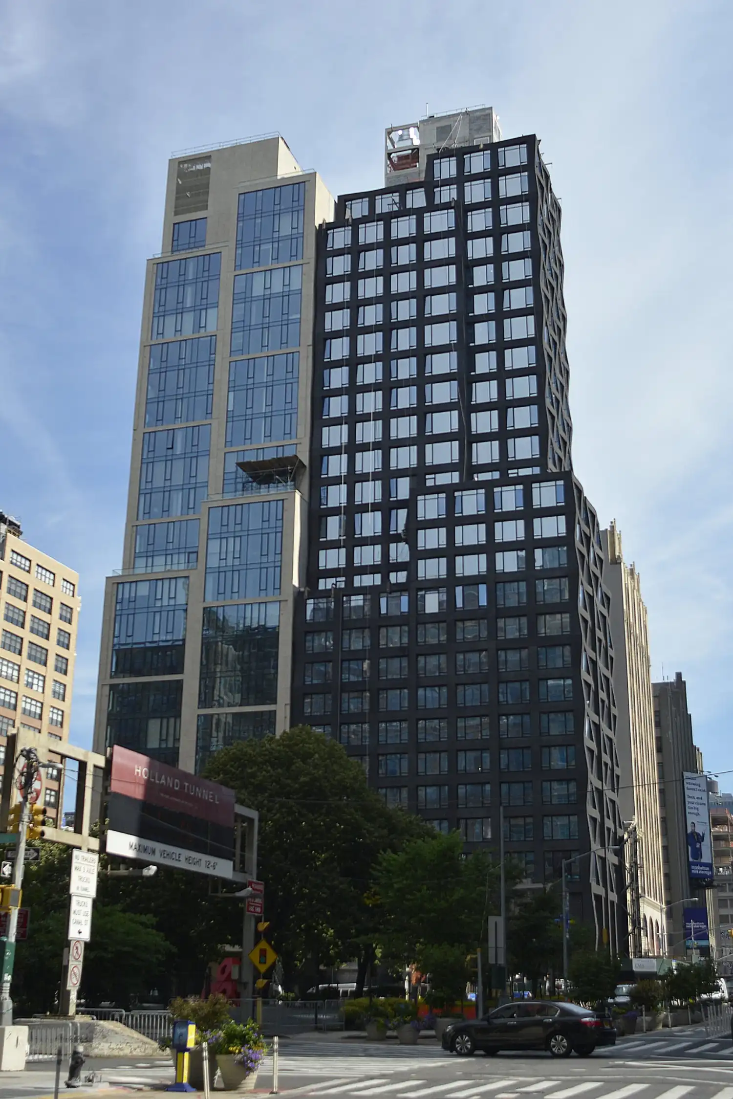 566 Broome is a luxury rental property located in the Soho Section of Manhattan. The street sides of this building are highly detailed, undulating pre-cast concrete panel and glass punch window façades that ascend to an illuminated beacon at the top of the tower. The north elevation of the building reacts to street facades as if it were sliced from a larger object. The main entrance of the building is located on the quiet side of Broome street. Finely conceived, the lobby compliments the park and sculpture that rests directly across the street. Continuing with the innovative design is the robotic parking system. Drivers can park their car and the machinery will safely stow it in a storage area on the second floor.